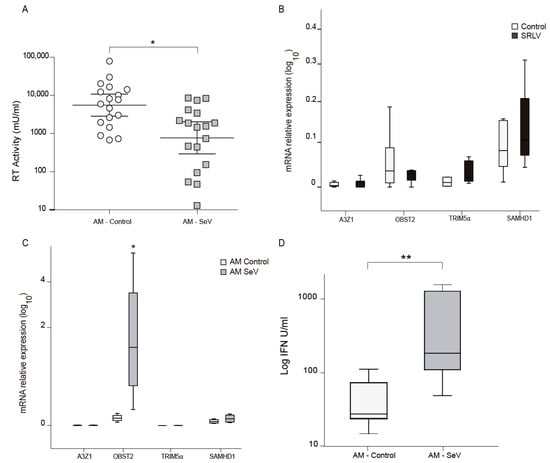 Antiviral activity induction after infection with Sendai virus (SeV). (A) RT activity in ovine skin fibroblasts (OSFs) cultured with supernatants from alveolar macrophages (AMs), infected or not with SeV, were infected with SRLV after 24 h of supernatant treatment. SRLV virus production was measured as retrotranscriptase (RT) activity in the supernatant at 72 h post infection. Data shown are the geometric mean ±95% CI of at least three independent experiments. Differences were statistically analyzed using unpaired T test, * p < 0.05. (B) Relative mRNA expression of the restriction factors after infection with SRLV. Data shown are the mean ± SEM of at least three independent experiments. * p < 0.05 (paired Mann–Whitney U test). (C) Relative mRNA expression of restriction factors: ovine APOBEC3Z1 (A3Z1) tetherin (oBST2), TRIM5α, and SAMHD1 measured by quantitative RT-PCR in ovine skin fibroblast (OSF) cultured with supernatants from AM control or AM infected with SeV. Values are the median (±interquartile range) of at least three independent experiments. * p < 0.05 (Mann–Whitney paired U Test). (D) Type-I interferon (IFN) quantification measured by an ovine-adapted IFN bioassay using supernatants from AM control or infected with SeV. Data shown are the median ±interquartile range of at least three independent experiments. * p < 0.05, ** p < 0.01 (Mann–Whitney paired U test).