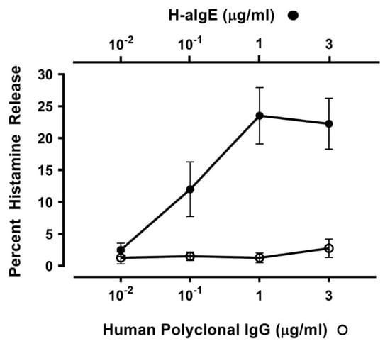 IgG anti-IgE (H-aIgE), purified from a small percentage of atopic dermatitis patients, induces histamine and LTC4 release from human basophils and mast cells [81]. The activating property of H-aIgE is mediated by the interaction with IgE on basophils and mast cells [82,91]. We used this human autoantibody to activate HLMCs in vitro. H-aIgE (10−2 to 3 μg/mL) caused a concentration-dependent histamine secretion from four different preparations of HLMCs isolated from HIV-1-negative subjects (Figure 1). As a control, we used IgG (10−2 to 3 μg/mL) purified from four normal donors which did not induce histamine release from HLMCs. These results indicate that mast cells purified from human lung have FcεRI-bound IgE.