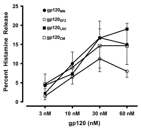 In a group of experiments we compared the effects of four recombinant gp120 (gp120MN, gp120SF2, gp120LAV, and gp120CM) derived from divergent HIV-1 isolates from different viral clades (B and E) of various geographical origins (United States, France, and Thailand) [74] (Table 1) on mediator release from HLMCs. These divergent samples of gp120 concentration-dependently (3 to 60 nM) induced histamine release from HLMCs (Figure 2). These results imply that the capacity to induce mediator release from HLMCs is a general feature of gp120 which has maintained throughout the evolution of the virus.