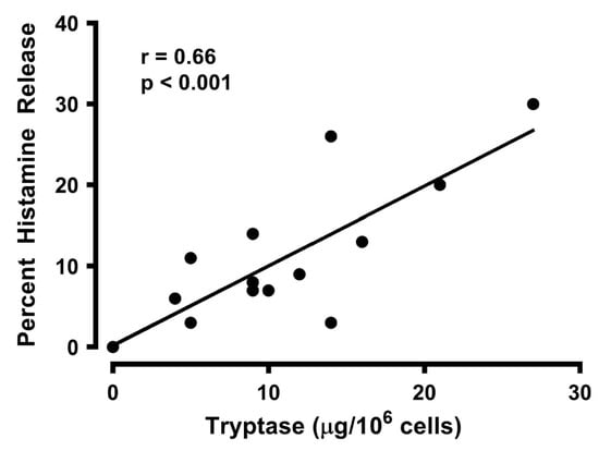 Correlation between the percent histamine release and tryptase secretion caused by gp120 from HLMCs. Each point represents the mean of duplicate determinations from separate experiments. r = 0.66; p < 0.001.