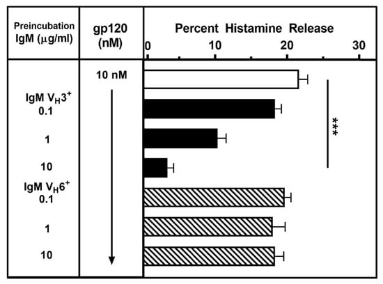 Effects of human monoclonal IgMs on the activation of HLMCs induced by gp120. gp120 (10 nM) was preincubated (15 min at 37 °C) with increasing concentrations (1 to 10 μg/mL) of human monoclonal IgM VH3+ or IgM VH6+. HLMCs were then added and incubation continued for 30 min at 37 °C. Each bar shows the mean ± SEM of histamine release from triplicate incubations. *** p < 0.001 when compared to controls.