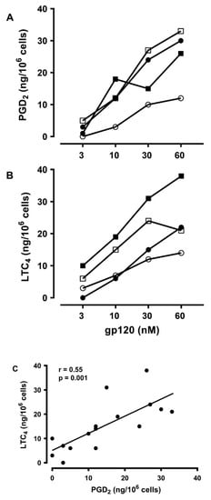 Activated human mast cells can rapidly synthesize several lipid mediators [23,89]. Prostaglandin D2 (PGD2) is the main cyclooxygenase metabolite synthesized de novo by human mast cells [78,96]. Activated human mast cells also synthesize cysteinyl leukotriene C4 (LTC4) through the 5-lipoxygenase pathway [96,97,98]. Both lipid mediators exert a variety of proinflammatory and vasoactive effects [99,100]. In four experiments, we evaluated the production of PGD2 and LTC4 from HLMCs in response to increasing concentrations of gp120. Figure 6 shows that gp120 (3 to 60 nM) caused the de novo synthesis of both PGD2 (Figure 6A) and LTC4 (Figure 6B). Figure 6C shows that there was a significant correlation between the production of PGD2 and of LTC4 caused by gp120 from HLMCs (r =0.55; p < 0.001).