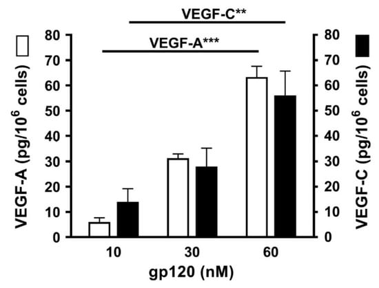 Vascular endothelial growth factors (VEGFs) are essential regulators of the development and functions of blood and lymphatic vessels [101,102]. VEGFs play a major role in new vessel formation and in pulmonary pathophysiology [33,103]. VEGF-A is the most potent proangiogenic molecule [34,104], whereas VEGF-C plays an essential role in inflammatory and tumor lymphangiogenesis [101,102]. Therefore, we investigated the effects of increasing concentrations (10 to 60 nM) of gp120 on the release of angiogenic (VEGF-A) and lymphangiogenic factors (VEGF-C) from HLMCs. HLMCs were cultured (6 h at 37 °C) with gp120 and, at the end of incubation, the release of VEGF-A and VEGF-C was assayed in the supernatants of mast cells. Figure 7 shows that gp120 concentration-dependently caused the release of VEGF-A and VEGF-C from four different preparations of HLMCs.