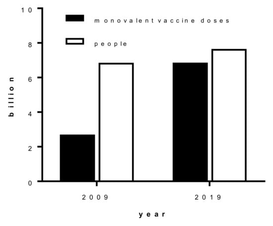 Comparison of estimated global vaccine capacity (15 μg HA/dose, black bars) and global population (white bars) in 2009 and 2019 (estimated from [6,7,8]).