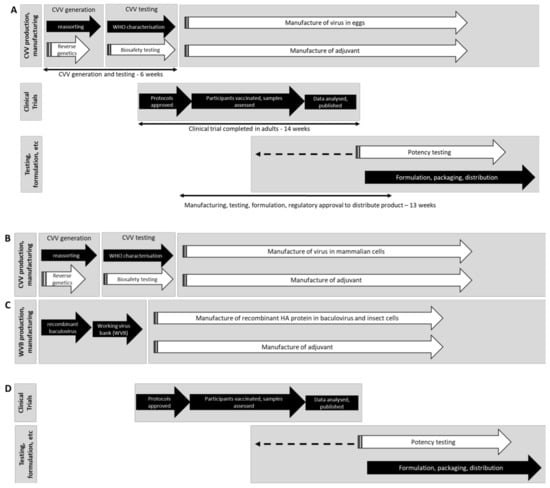 In 2009, over 95% of the registered influenza vaccines in the world were generated in embryonated hen’s eggs and at least two-thirds of influenza vaccines were produced by just seven manufacturers [11]. This included split virion and sub-unit vaccines, as well as live attenuated intranasal vaccines [11]. Since 2009, the number of influenza vaccine manufacturers has significantly increased (currently at least 32 manufacturers with full-scale manufacturing facilities and licensed vaccines) and manufacturing is more widespread, particularly in Asia and South America ([11,12,13,14], E. Sparrow personal communication). Furthermore, a number of new technologies have been developed or expanded and are now registered for use in producing influenza vaccines. These include the increased use of mammalian cells to grow viruses, and the further use of baculovirus and insect cell expression systems as well as other expression systems such as plant-based vaccine production systems that are also in late stage development [15,16]. Most of these systems are now being utilised for seasonal influenza vaccines but could be rapidly re-deployed to produce a pandemic influenza vaccine when required. Moreover, vaccines produced using nanoparticles and chimeric HAs have been recently used in phase 1 clinical trials and have potential to be used in the context of a pandemic [17,18,19]. There are key differences in the manufacturing processes of egg, cell and recombinant protein systems to ensure that the maximum number of doses for each platform are produced (Figure 2). Egg-based influenza vaccines require the development of high growth reassortants to improve virus yield, a process which involves either reassorting candidate vaccine viruses (CVV) with high growth laboratory strains of influenza, or the use of “reverse-genetics” (RG), whereby influenza viruses are produced “synthetically” using a series of plasmids encoding the gene segments of the pandemic virus and the high growth laboratory strain [20]. Both activities occur in just a handful of specialised laboratories. These reassorted/RG CVVs must undergo antigenic analysis, sequencing of the HA and neuraminidase (NA) genes and preliminary yield evaluation prior to large-scale production. Our experience from generating vaccines over many decades, including for the pandemics of 1957, 1968 and 2009 and for pre-pandemic strains such as A(H5N1) and A(H7N9), is that the yield of vaccine available is determined by the specific strain. Cell culture production systems, such as those that use various forms of MDCK or Vero cells, allow for faster scale-up in case of pandemics, as they are not limited by the supply of embryonated hen’s eggs. Wildtype CVVs may be used if the pandemic virus is of low pathogenicity and the virus is high yielding in cell-based production, otherwise CVVs generated by reverse genetics may be required. Cell culture vaccines may also offer an advantage with certain influenza viruses by providing antigenically better matched vaccines to some influenza strains in humans by avoiding egg adaptions, which can reduce vaccine effectiveness [21]. Vaccines that utilise conventional recombinant protein technologies have the advantage of not requiring the pandemic virus or a CVV for production and can instead be produced with just the sequence of the HA (and other genes such as the NA or matrix if required). This approach requires a suitable expression system for the particular system in use (such as baculovirus, E. coli, mammalian or plant cells) for manufacture. This is estimated to take 2–3 weeks to produce [22], which is 3–4 weeks quicker than the generation and testing of a reassorted CVV for egg vaccine manufacture in 2009 [23] (Figure 2). Even with the advent of these new technologies since 2009, the testing and downstream process requirements align most of these products with respect to vaccine availability. Currently, egg-based influenza vaccines still constitute around 85%–90% of doses given annually, and so progress away from egg manufacturing of influenza vaccines has been and is likely to continue to be slow. This may be enhanced by the recent announcement of a US Presidential Executive order made on 19 September 2019 that “directs actions to reduce the United States’ reliance on egg-based influenza vaccine production……” among other measures to enhance the US preparedness for influenza pandemics (see [24]).