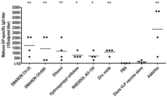 For the screen, mice were immunized three times with PBS, the Ebola VLP vaccine only, or the Ebola VLP vaccine plus test compound [100 µg/dose; except for ethanol, which was used at 10% (v/v)] by intramuscular administration in a 100 µL volume with a two-week interval between the vaccinations. Ebola VLP vaccine plus AddaVax was used as a positive control. On day 14 after the boost-immunization and day 14 after the third immunization, serum samples were collected from the immunized mice and subjected to ELISA to measure the titers of GP-specific antibodies. The antibody titers for the second immunization were relatively lower than those for the third immunization (Table S1). No antibody against Ebola GP protein was detected in the PBS group (Figure 2 and Table S1). Most of the mice immunized with the Ebola VLP vaccine alone produced no or low levels of GP-specific antibodies after three immunizations (Figure 2 and Table S1). For the statistical analysis of the GP-specific total titers, the values were transformed to the log 2 scale to stabilize the variance (Table S2). We defined hits as compounds that induced significantly higher antibody titers when combined with the Ebola VLP vaccine compared with the Ebola VLP vaccine alone group. According to these criteria, we identified six compounds that enhanced antibody production compared with Ebola VLP vaccine alone after three immunizations: EMANON CH-25 [polyoxyethylene (25) hydrogenated castor oil], EMANON CH-60K [polyoxyethylene (60) hydrogenated castor oil], ethanol, hydroxypropyl cellulose, RHEODOL AO-15V (sorbitan sesquioleate), and zinc oxide (Figure 2). These six hits are all novel adjuvant candidates for Ebola VLP vaccine. EMANON CH-25 induced the highest level of GP-specific antibodies after the third immunization (Figure 2 and Table S1).