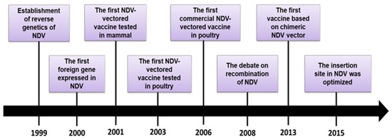 Establishment of reverse genetics of NDV initiated the exploration of the virus as a vector. During the past 20 years, a variety of foreign genes have been expressed in the NDV backbone and the knowledge about the safety, insertion site of foreign genes and vector optimization has grown drastically. In this section, the history is delineated by highlighting some key milestones from our point of view (Figure 1).