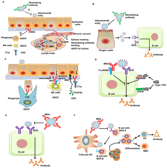 The mechanisms and hypotheses of vaccination inhibition by maternally derived antibody. (A) An overview of the impact of maternally derived antibody (MDA) on vaccination in different stages of immune response. (1) Neutralizing antibodies block the attachment and entry of the virus into cells. Epithelial cells are used here as an example of the vaccine recipient cells. (2) After virus replication and expression of the virus antigen on cell surface, MDA bridges virus-infected cells and effector cells, inducing immune effector functions, including antibody-dependent cellular cytotoxicity (ADCC), antibody-dependent cell-mediated phagocytosis (ADCP) and complement-dependent cytotoxicity (CDC), to clear virus-infected cells. (3) Upon entering the blood stream, the virus is recognized by MDA in the circulation, leading to epitope masking, neutralization and phagocytosis of the virus particles by phagocytes in the blood. (4) In lymph nodes, high titers of MDA modulate the differentiation of B cells into plasma cells (PC) and memory B cells (MBC) in the germinal centers. (5) Cross-linkage complex of the virus, B cell receptor (BCR) and FcγRIIB suppresses B cell activation. (B) Vaccination inhibition by neutralization. Binding of neutralizing antibodies to the virus blocks the attachment and entry of the vaccine virus and subsequently the virus replication required for antibody response. (C) Clearance of virus-infected cells by Fc-dependent effector functions. MDA binds to the viral antigen on the cells and antibody Fc domain binds to Fc receptors (FcR) on effector cells. Phagocytes engulf virus-infected cells (ADCP) and natural killer (NK) cells release granzyme and perforin to kill the cells (ADCC). IgG Fc binds to complement (C1q), leading to production of C3a/C5a and membrane attack complex (MAC) to eliminate infected cells (CDC). (D) Inhibition of antibody response by BCR-FcγRIIB cross-linkage. The inhibitory motif in FcγRIIB suppresses activation of B cells by cross-linking to antigen-specific BCR. Binding of type I interferon (IFN) to the IFN receptor (IFN-R) and complement receptor (CR) 2 provides a positive signal for B cell simulation. (E) Epitope masking. MDA binds to the immunodominant epitopes in the virus and thus blocks recognition of them by BCR. (F) Shaping B cell differentiation in the germinal centers. MDA recognizes the immunodominant epitopes and inhibits maturation of the B cells targeting these epitopes (B cells with BCR A). Maturation of the B cells targeting the non-immunodominant epitopes (B cells with BCR B) is enhanced but differentiation into PC and MBC is suppressed.