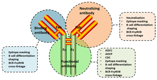 Possible mechanisms of vaccination inhibition by different classes of antibody. The functional roles of the antigen-binding domain (Fab) include recognizing viruses or virus-infected cells, mediating epitope masking, shaping of B cell differentiation in germinal centers and cross-linkage between B cell receptor and FcγRIIB. Additionally, antibodies targeting neutralizing epitopes induce virus neutralization and the interaction between the Fc domain and Fc receptors triggers antiviral effector functions, including antibody-dependent cellular cytotoxicity, antibody-dependent cell-mediated phagocytosis and complement-dependent cytotoxicity.