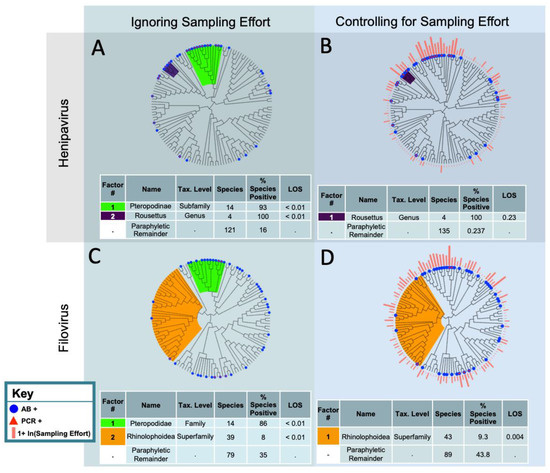 Phylofactorization of the bat species that have been PCR or antibody positive for filoviruses and henipaviruses. The phylogeny is from the Open Tree of Life. The analysis was performed using generalized phylofactor regression. The outcome variable is evidence of infection, determined using either PCR or antibody positivity. The factor name and taxonomic level was determined by identifying the most basal taxonomic grouping shared by all species in the clade. The % species positive is the proportion of species PCR or antibody positive within the factor. Level of significance (LOS) refers to the value of the objective function for a clade in relation to the distribution of objective function values from the null simulations. Factors are ordered from top to bottom by their LOS. (A) Analysis excludes bats that have not been sampled for henipaviruses and does not account for sampling effort. (B) Analysis excludes bats that have not been sampled for henipaviruses and does account for sampling effort. (C) Analysis excludes bats that have not been sampled for filoviruses and does not account for sampling effort. (D) Analysis excludes bats that have not been sampled for filoviruses and does account for sampling effort.