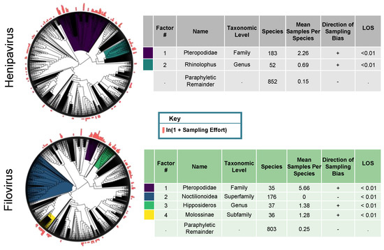 Phylofactorization of filovirus and henipavirus sampling effort across the full bat phylogeny. The phylogeny is from the Open Tree of Life. The outcome variable is the natural log transform of our metric of sampling effort. Our metric of sampling effort was the number of unique sampling events per species. The factor name and taxonomic level was determined by identifying the most basal taxonomic grouping shared by all species in the clade. Level of significance (LOS) refers to the value of the objective function for a clade in relation to the distribution of objective function values from the null simulations. Factors are ordered from top to bottom by their LOS. The taxonomic level was determined by identifying the most basal taxonomic grouping shared by all species in the clade.