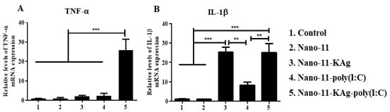 Initially to evaluate whether binding of poly(I:C) on Nano-11 enhances the activation of APCs, and poly(I:C) does not interfere with co-adsorbed KAg binding, an in vitro experiment was performed on MoDCs. The MoDCs treated with Nano-11-KAg-poly(I:C) had a significantly augmented (p < 0.001) TNF-α mRNA expression compared to all the controls such as Nano-11, Nano-11-KAg and Nano-11-poly(I:C) (Figure 1A). The IL-1ß mRNA expression was significantly enhanced (p < 0.001 and p < 0.01) in both Nano-11-KAg and Nano-11-KAg-poly(I:C) treated cells compared to the other three controls, including the Nano-11-poly(I:C) (Figure 1B).