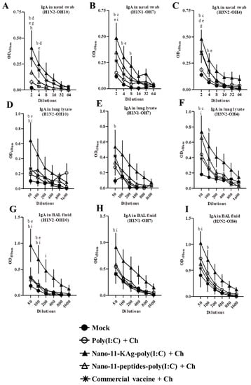 Poly(I:C) adjuvanted Nano-11-KAg vaccine induced increased cross-reactive SIgA antibody response. Pigs were vaccinated twice with poly(I:C) adjuvanted Nano-11-based vaccines (containing H1N2-OH10 virus or 10 peptides) or commercial vaccine (containing H1N1, H1N2 and H3N2 viruses) and challenged (H1N1-OH7 virus) at 35 days post prime vaccination. Samples collected at day six post-challenge were used for SIgA antibody analysis. Secretory IgA antibody response in nasal swab, lung lysate, and BAL fluid samples against (A,D,G) H1N2-OH10; (B,E,H) H1N1-OH7; and (C,F,I) H3N2-OH4 viruses were analyzed by ELISA. Data represent the mean value of four to five pigs ± SEM at all indicated dilutions. Statistical analysis was carried out using two-way ANOVA followed by a Bonferroni test. Each letter indicates the significant difference between the groups at the indicated dilution. b, c, and d indicate the difference between mock group compared to Nano-11-KAg-poly(I:C) + Ch, Nano-11-peptide-poly(I:C) + Ch, and Commercial vaccine +Ch, respectively. e and g indicate the difference between poly(I:C) + Ch compared to Nano-11-KAg-poly(I:C) + Ch, and Commercial vaccine +Ch, respectively. h and i indicate the difference between Nano-11-KAg-poly(I:C) + Ch compared to Nano-11-peptide-poly(I:C) + Ch and Commercial vaccine +Ch, respectively. A p < 0.05 was considered statistically significant. Ch—Challenge.