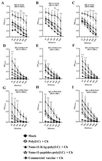 Commercial influenza vaccine augmented systemic IgG response and Nano-11-KAg-poly(I:C) vaccine in lower respiratory tract. Pigs were vaccinated twice with poly(I:C) adjuvanted Nano-11-based vaccines (containing H1N2-OH10 virus or 10 peptides) or commercial vaccine (containing H1N1, H1N2 and H3N2 viruses) and challenged (H1N1-OH7 virus) at 35 days post prime vaccination. Samples collected at day six post-challenge were used for IgG antibody analysis. The IgG antibody response in serum, lung lysate, and BAL fluid samples against (A,D,G) H1N2-OH10; (B,E,H) H1N1-OH7; and (C,F,I) H3N2-OH4 viruses were analyzed by ELISA. Data represent the mean value of four to five pigs ± SEM at all indicated dilutions. Statistical analysis was carried out using two-way ANOVA followed by a Bonferroni test. Each letter indicates the significant difference between the groups at the indicated dilution. b and d indicate the difference between mock group compared to Nano-11-KAg-poly(I:C) + Ch, and Commercial vaccine +Ch, respectively. g indicate the difference between poly(I:C) + Ch compared to Commercial vaccine +Ch. h and i indicate the difference between Nano-11-KAg-poly(I:C) + Ch compared to Nano-11-peptide-poly(I:C) + Ch and Commercial vaccine +Ch, respectively. j indicates difference between Nano-11-peptide-poly(I:C) + Ch) compared to Commercial vaccine +Ch. A p < 0.05 was considered statistically significant. Ch—Challenge.