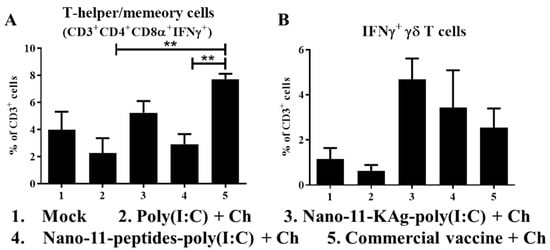 The frequency of IFNγ secreting T-helper/memory (CD3+CD4+CD8α+) cells was significantly increased (p < 0.01) in animals vaccinated with the commercial vaccine (Figure 4A). On the other hand, a higher frequency of IFNγ secreting γδ T cells was noticed in Nano-11-KAg-poly(I:C) vaccinates, although this did not reach statistical significance (Figure 4B). However, Nano-11-KAg-poly(I:C) inoculation did not increase IFNγ secreting CD3+CD4-CD8αβ+ and CD3+CD4+CD8α- T cell population (data not shown).