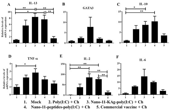We determined the mRNA expression of the cytokines IL-2, IL-6, TNF-α, IL-10 and IL-13 as well as the transcription factor GATA3 in the TBLN. IL-13 and GATA3 are associated with Th2 responses and IL-2 and TNF-α with Th1 responses, whereas IL-10 is an immunosuppressive cytokine and IL-6 a proinflammatory cytokine. Both Nano-11-KAg-poly(I:C) and Nano-11-peptides-poly(I:C) immunization significantly increased (p < 0.05 and p < 0.01) IL-13 mRNA compared to the commercial vaccine and mock groups (Figure 5A). Nano-11-KAg-poly(I:C) vaccine also had increased GATA3 mRNA expression compared to other groups (Figure 5B). The expression of IL-10 mRNA was significantly higher (p < 0.05 and p < 0.01) in both the Nano-11-based influenza vaccines group compared with the mock group (Figure 5C). TNF-α cytokine gene expression was increased in Nano-11-KAg-poly(I:C) vaccinates compared to other groups, and it was significantly increased (p < 0.05) compared with the mock group (Figure 5D). Notably, both Nano-11-KAg-poly(I:C) and Nano-11-peptides-poly(I:C) groups had significantly increased (p < 0.01) IL-2 mRNA expression compared to the mock and commercial vaccine administered animals (Figure 5E). IL-6 gene expression was increased in both Nano-11-containing influenza vaccine groups compared to other vaccinates (Figure 5F).
