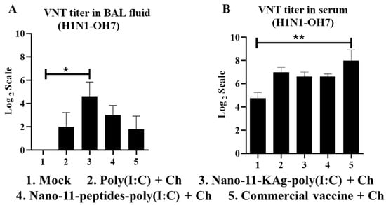Nano-11-KAg-poly(I:C) and commercial influenza vaccines induced increased virus neutralization test titers in BAL fluid and serum of pigs, respectively. The H1N1-OH7 challenge virus-specific virus neutralization antibody titer in (A) BAL fluid; and (B) Serum samples collected at post-challenge day 6. Data represent the mean value of four to five pigs ± SEM. Statistical analysis was carried out using one-way analysis of variance followed by Tukey’s post hoc comparison. Asterisk refers to statistical difference between the two indicated groups (* p < 0.05, and ** p < 0.01). Ch—Challenge.