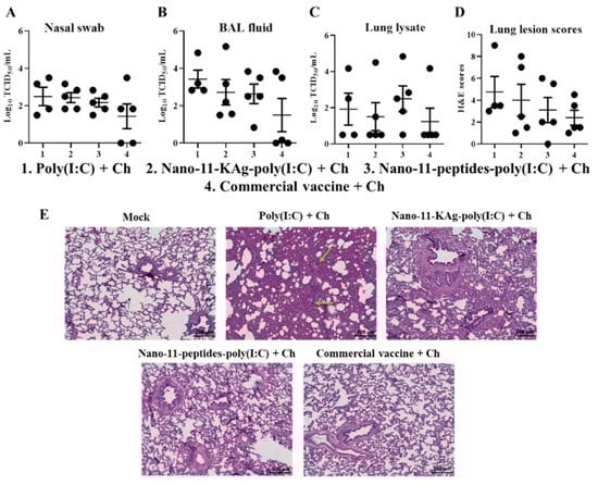Nano-11 and commercial influenza vaccines reduced the challenge virus titer and virus induced lung pathology. Pigs were vaccinated twice with poly(I:C) adjuvanted Nano-11-based vaccines (containing H1N2-OH10 virus or 10 peptides) or commercial vaccine (containing H1N1, H1N2 and H3N2 viruses) and challenged (H1N1-OH7 virus) at 35 days post prime vaccination. Samples collected at day six post-challenge were used in the analyses. Challenge live SwIAV titer in (A) Nasal swab; (B) BAL fluid; and (C) Lung lysate. (D) Severity of lung lesions based on evaluation of hematoxylin and eosin-stained sections; and (E) Representative lung sections of experimental pigs in each group stained with hematoxylin and eosin were examined and microscopic images were taken at 10x magnification (green arrows show the sites of inflammation). Data represent the mean value of four to five pigs ± SEM. Ch—Challenge.