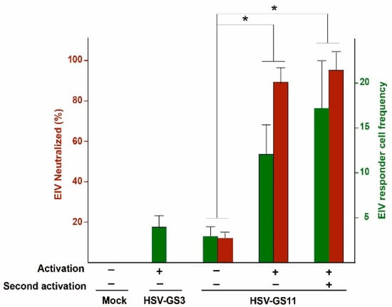 If the efficient but limited replication of an RCCV results in a substantially enhanced immunity against the type of herpesvirus from which the RCCV was derived when compared to the immunity induced by a non-replicating herpesvirus, one might expect a correspondingly strengthened immune response against a heterologous antigen if it is expressed from a replicating RCCV. Hence, RCCVs should be potent carriers of heterologous antigens. To test this hypothesis, expressible genes for the hemagglutinin (HA) or the nucleoprotein (NP) of equine influenza virus Prague/56 (EIV Prague/56) were introduced into the UL37/38 intergenic region of RCCV HSV-GS3 (see Figure 1G for HSV-GS11, a recombinant expressing HA). Mice were inoculated on their rear feet with the heterologous antigen-carrying recombinants which were either activated (once or twice) or left unactivated. HSV-GS3 served as a control. Three weeks later, neutralizing antibody titers were assessed and responder cell frequencies determined in a lymphoproliferation assay. Results obtained from such an experiment employing recombinant HSV-GS11 are represented in Figure 3 (originally reported in Reference [40] Immunization with activated HSV-GS11 induced a several-fold higher level of EIV-specific neutralizing antibodies than immunization with unactivated HSV-GS11. No neutralizing antibodies were detected in sera from animals immunized with HSV-GS3. Similarly, the level of HA-specific responder cells was much higher in PBMCs from animals immunized with activated HSV-GS11 than in PBMCs from animals immunized with the unactivated vector. For reasons to be explored, a weak response was also induced by HSV-GS3. Hence, efficient but limited vector replication resulted in an impressive enhancement of HA-specific humoral and cellular responses.