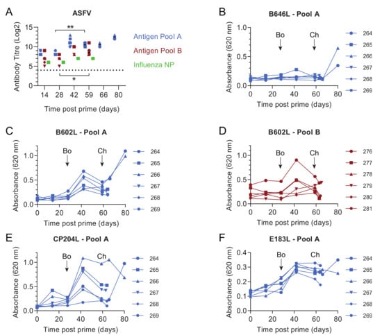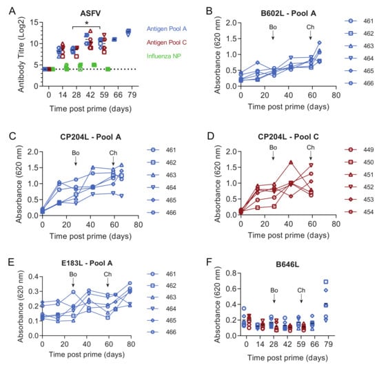 - Reis, A.L.; Parkhouse, R.M.; Penedos, A.R.; Martins, C.; Leitao, A. Systematic analysis of longitudinal serological responses of pigs infected experimentally with African swine fever virus. J. Gen. Virol. 2007, 88, 2426–2434. [Google Scholar] [CrossRef]