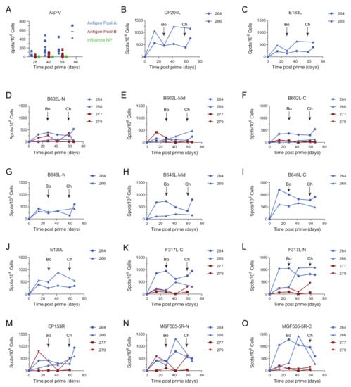 3.1. Pools of Eight Viral Vectors Induce ASFV-Specific and Antigen-Specific Responses in Swine