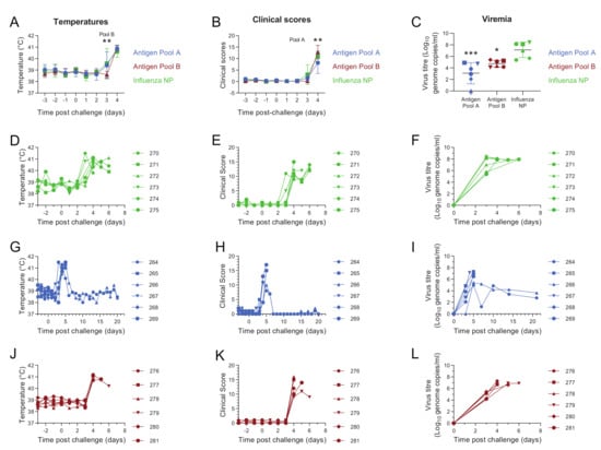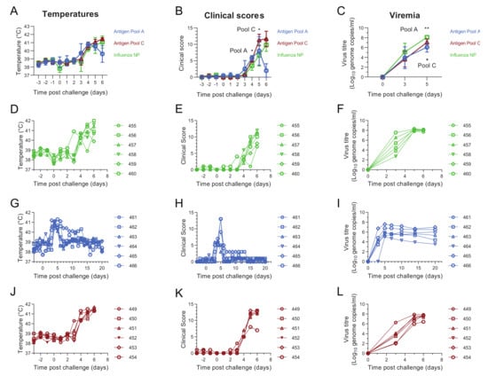 3.2. Comparative Evaluation of Temperatures, Clinical Signs and Viremia Levels in Experiment 1