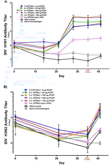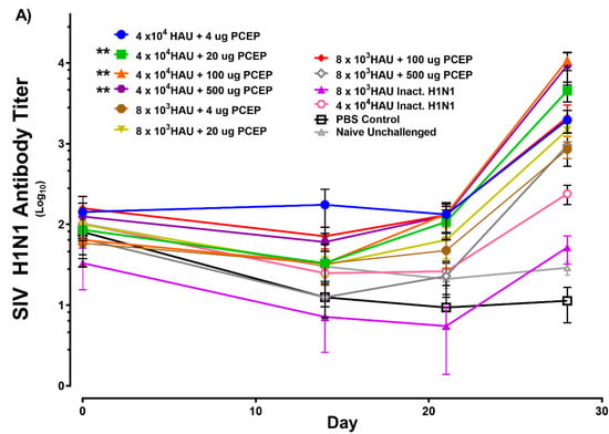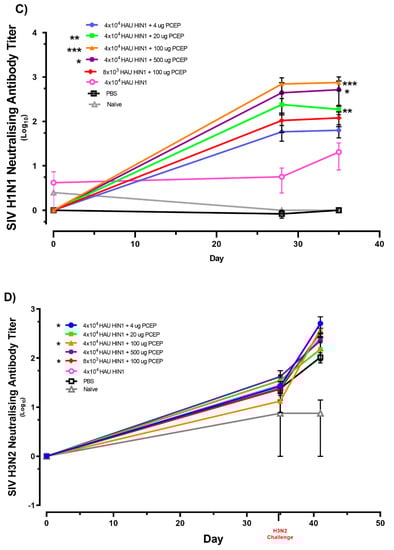 Next, we followed up piglets in the PCEP-adjuvanted 4.0 × 104 HAU inactivated SIV H1N1 vaccinated groups with a challenge study using heterologous live SIV H3N2 to determine if piglets immunized against inactivated H1N1 were protected against virulent H3N2. Results show that 4.0 × 104 inactivated SIV HAU + 100 μg PCEP and 4.0 × 104 inactivated SIV HAU + 500 μg PCEP induced significant antibody responses against H1N1 (p < 0.05) and (p < 0.01), respectively) relative to the naïve unchallenged group at day 41 (Figure 3A). These antibodies were neutralizing against HIN1 in the groups immunized with 4.0 × 104 inactivated SIV HAU + 20 μg PCEP, 4.0 × 104 inactivated SIV HAU + 100 μg PCEP, 4.0 × 104 inactivated SIV HAU + 500 μg PCEP doses (p < 0.01, p < 0.001, and p < 0.05, respectively) compared to naïve unchallenged group (Figure 3C).