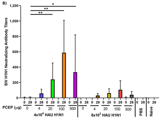 Vaccine-induced H1N1 antibody responses and neutralizing antibody responses in pigs. Pigs (n = 6 per group) were immunized with 4.0 × 104 or 8.0 × 103 inactivated SIV HAU alone or plus 4, 20, 100 or 500 μg PCEP. Control animals were either injected with PBS or not immunized (naïve). A secondary immunization was performed on day 21 and sera samples were collected over a period of 28 days. (A) Anti-H1N1 IgG antibodies were assessed by ELISA and (B) anti-H1N1 IgG neutralizing antibodies were assessed. Data for animal group are presented with mean values indicated by a horizontal bar and standard error of the mean are shown. p < 0.05 (*), and p < 0.01 (**).