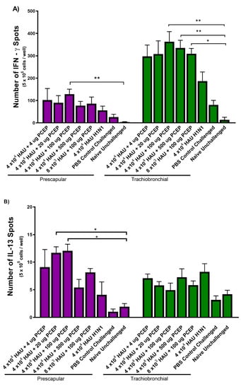 Tracheobronchial and prescapular lymph nodes draining the vaccination and challenge sites were dissected 6-days post-challenge and the cells were isolated and processed to generate a cell suspension following the protocol detailed in [] with few modifications. The single-cell suspensions were restimulated with inactivated SIV H1N1 at the concentration of 25 μg/mL. The frequency of IFN-γ, IL-13 and IL-17A-producing cells was determined by ELISPOT. Under sterile condition, separate Millipore MultiScreen HA ELISPOT plates (Fisher Scientific # MAHAS4510, Thermo Fisher Scientific, Waltham, MA, USA) were coated overnight at 4 °C with Rabbit Anti-Porcine-IL-17A (Cedarlane# KP0498S-1000 (KingFisher Biotech Inc., St. Paul, MN, USA)), mouse Mab anti-porcine IFN-γ (ThermoFisher-EN-MP700, Thermo Fisher Scientific, Waltham, MA, USA) and Goat Anti-Po-IL-13 antibody (Cedarlane# PB0094S-100 (KingFisher Biotech Inc.)) diluted in coating buffer to 2, 5 and 3.5 μg/mL respectively. Plates were then washed four times with phosphate-buffered saline supplemented with 0.05% Tween 20 (PBST; Sigma-Aldrich) then 5 × 105 cells were seeded in 100 μL AIM-V supplemented with 2% FBS medium per well in triplicate wells. Plates were incubated at 37 °C, 5% CO2, for 16 h (IFN-γ) or 35 h (IL-17A & IL-13), washed 5 times with PBST, and respective plates were incubated for 2 h with detection antibodies at either 0.2 μg/well biotinylated rabbit anti-pig-IL-17A (Cedarlane# KPB0499S-050 (KingFisher Biotech Inc.)), rabbit anti-pig IFN-γ (Fisher# # PP700) or 1 μg/mL Goat anti -Pig-IL-13 (Cedarlane# PBB0096S-050 (KingFisher Biotech Inc.)). IL-17A and IL-13 plates were washed 5× with PBST, and 100 μL of streptavidin-alkaline phosphatase was added and incubated for 90 min. After washing 8× in distilled water, 100 μL freshly prepared BCIP/NBT (Sigma-Aldrich# B5655, Oakville, ON, Canada) was added to each well and incubated for 3–20 min. Plates were washed with distilled water to stop the reaction and air-dried overnight before spot enumeration on an AID ELISPOT Reader model ELRO7 (IFL; AID GmbH, Strassberg, Germany) in conjunction with AID EliSpot Reader software version 7.0. The IFN-γ plates were treated with a secondary antibody, goat anti Rabbit IgG (H + L) biotin, for 2 h, prior to the 90 min 100 μL of streptavidin-alkaline phosphatase incubation, and BCIP/NBT developed similarly to the IL-17A and IL-13 plates. The number of IFN-γ and IL-17A and IL-13-producing cells per million cells from each tissue were determined by multiplying the number of spots per well by 2 and then averaging values from triplicate wells.