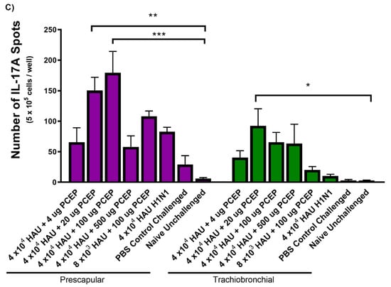 At necropsy, we collected prescapular and tracheobronchial lymph nodes draining the vaccination and challenge sites, respectively. The lymph nodes were processed to single-cell suspension, and restimulated with inactivated SIV H1N1. We assayed for cytokine production by ELISPOT analysis to assess the antigen-specific cell-mediated immune responses. We observed significantly increased number of IFNγ-producing cells in tracheobronchial lymph nodes (i.e., the site of viral challenge) in animals immunized with 4.0 × 104 inactivated SIV HAU + 20 μg PCEP, 4.0 × 104 inactivated SIV HAU + 100 μg PCEP, 4.0 × 104 inactivated SIV HAU + 500 μg PCEP and 8.0 × 103 inactivated SIV HAU + 100 μg PCEP (p < 0.01, p < 0.01, p < 0.01 and p < 0.05, respectively) relative to the naïve unchallenged pigs. Relatively fewer IFNγ-producing cells were obtained from prescapular lymph nodes, the site of vaccine injection (Figure 4A). In contrast, pigs immunized with 4.0 × 104 inactivated SIV HAU + 20 μg PCEP and 4.0 × 104 inactivated SIV HAU + 100 μg PCEP showed significantly higher IL-13 secreting cells (p < 0.05 and p < 0.01, respectively) from the prescapular lymph nodes cells relative naïve unchallenged pigs. IL-13-secreting cells from tracheobronchial lymph nodes cells were not significantly increased in any vaccinated pigs relative to naïve unchallenged pigs (Figure 4B). Further, in pigs immunized with 4.0 × 104 inactivated SIV HAU + 20 μg PCEP and 4.0 × 104 inactivated SIV HAU + 100 μg PCEP, we observed significantly higher IL-17A secreting cells (p < 0.01 and p < 0.001, respectively) from cells from the prescapular lymph nodes cells relative to naïve unchallenged pigs (Figure 4C). IL-17A-secreting cells were not significantly increased in tracheobronchial lymph nodes of any vaccinated pigs relative to either control group (Figure 4C).