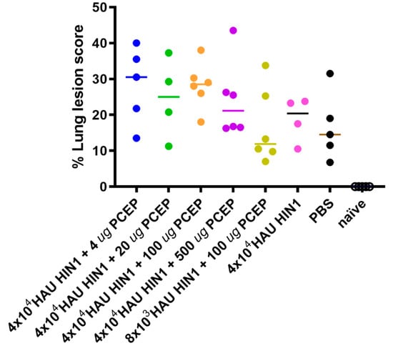 Lesion scores in lungs of vaccinated and challenged animals. Pigs (n = 6) were immunized then boosted at day 21 via intradermal routes with 4 × 104 or 8 × 103 HAU H1N1 plus 0–500 μg PCEP adjuvant or PBS as indicated. Naïve animals were neither immunized, nor challenged. The challenge dose was 8 × 105 PFU virulent H3N2 SIV via the intratracheal route on day 35 and all animals were killed 6 days after challenge. The lung lesion scores were assessed (as indicated in the methods) up to 6-days post challenge. Each data point indicates an individual animal and the horizontal bar represents the median. The colors of each data point are coordinated with the group colors from Figure 1, Figure 2 and Figure 3.