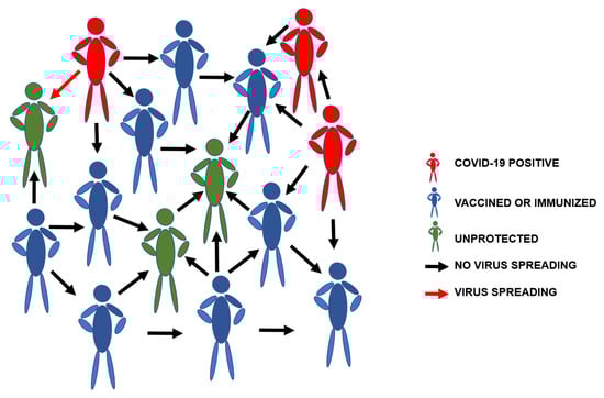 Interpreting the scientific concept of collective/group immunity as the resistance that a certain community possesses against an infection, Fox pointed out four conditions under which such immunity can occur []. Initially, the infectious pathogen must be found and restricted to a single host. For severe acute respiratory syndrome coronavirus 2 (SARS-Cov-2), the primary transmission was zoonotic, with its natural reservoir being the bat. However, the intermediate host through which it was transmitted to humans is uncertain (a ferret is hypothesized). Transmission is believed to have occurred due to direct contact with the infected animals or through their secretions. Viral RNA has also been found in dogs and cats living with coronavirus disease 2019 (COVID-19) positive humans. However, it has not been shown that these animals can transmit the virus to people [].