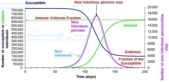 Based on the dynamics of the established relationships, in the absence of a vaccine, protective measures, or treatment alternatives, it is logical to assume that at the beginning of the spread of SARS-CoV-2 in a standard population with random contacts and zero people recovered or immune, there would be a rapid growth of infected cases, reaching the maximum number of cases per unit of time at the point on the Cartesian plane where the line of decreasing susceptibility crosses that of those recovered or resolved in growth and reaching a level of endemicity (stability) when the critical immunological fraction or the population immunity necessary for probable infection among the susceptible cases trends toward zero [] (Figure 3).