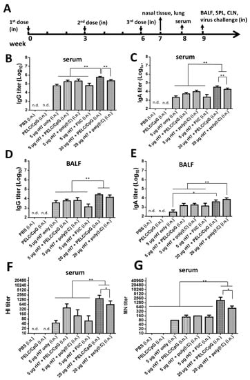 Figure 1. Antibody responses in sera and BALFs elicited by intranasal immunizations with rH7 proteins formulated in PELC nanoemulsion plus CpG. (A) Groups of mice were intranasally immunized with three doses of 5 or 20 µg rH7 protein formulated with PELC/CpG, poly (I:C), or FliC over a 3-week interval. Serum and BALF samples were collected and analyzed using ELISA to measure (B,D) H7-specific IgG and (C,E) IgA antibody titers. Hemagglutination (HA) inhibition and neutralization antibody titers in sera were respectively determined using (F) hemagglutination inhibition (HI) and (G) microneutralization (MN) assays. n.d. (not detected). Statistical analysis consisted of one-way ANOVA. *, p < 0.05; **, p < 0.01.