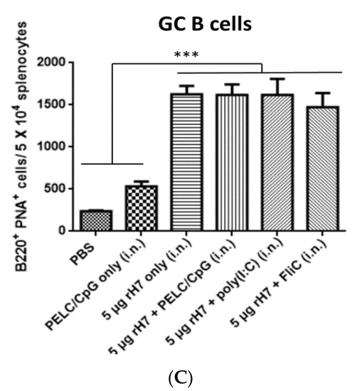 Splenocytes were collected at 3 weeks following the third immunization of the mice, stimulated with rH7 proteins, and analyzed with the enzyme-linked immunospot (ELISPOT) assay for IgG- and IgA-ASCs. At the 5 μg dose for rH7 immunizations, the use of the PELC/CpG adjuvant significantly increased the numbers of IgG-ASCs but maintained similar numbers of IgA-ASCs in the spleen, followed by the use of poly (I:C) and FliC adjuvants (Figure 2A,B). At the 20 μg dose rH7 immunizations, the PELC/CpG adjuvant induced higher numbers of IgG-ASCs and IgA-ASCs in the spleen than poly (I:C) (Figure 2A,B). GC B cells from rH7-stimulated splenocytes were also determined using flow cytometry analysis, which showed no differences with or without the use of the PELC/CpG, poly (I:C), or FliC mucosal adjuvant (Figure 2C). Therefore, intranasal rH7 immunizations with the use of the PELC/CpG, compared to poly (I:C) and CpG adjuvants, elicited higher H7-specific IgG- and IgA-ASCs but not GC B cells in the spleen.