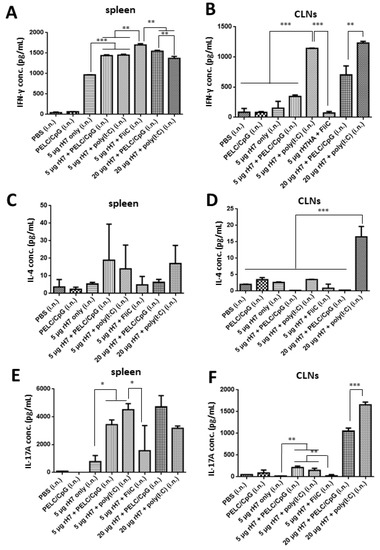 Figure 3. T cell responses in splenocytes and CLNs induced by intranasal immunizations with rH7 proteins. Splenocytes and CLNs collected from immunized mice were cultured and stimulated with rH7 proteins. Culture supernatants were analyzed using ELISA to measure (A,B) IFN-γ, (C,D) IL-4, and (E,F) IL-17A cytokine levels to determine H7-specific Th1, Th2, and Th17 cell activation, respectively. Statistical analysis consisted of one-way ANOVA. *, p < 0.05; **, p < 0.01; ***, p < 0.001.