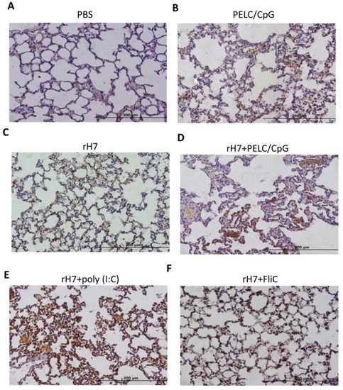 Figure 4. IL-17 expression in lung tissues. One week after the final immunization, lung sections from mice (N = 3 per group) intranasally immunized with (A) PBS alone, (B) PELC/CpG alone, (C) rH7 alone, (D) rH7 + PELC/CpG, (E) rH7 + poly (I:C), or (F) rH7 + FliC were collected and stained with anti-IL-17A antibodies for the observation of IL-17 secretion under an Olympus DP70 microscope (×400 magnification).