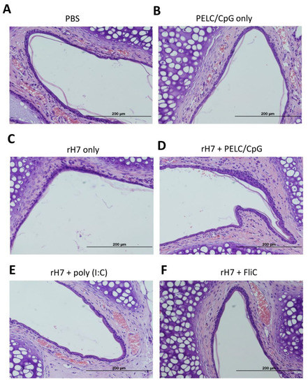 Figure 5. Representative photographs of nasal tissue sections (×400 magnification). Groups of mice (N = 3 per group) were intranasally immunized with (A) PBS alone, (B) PELC/CpG alone, (C) rH7 alone, (D) rH7 + PELC/CpG, (E) rH7 + poly (I:C), or (F) rH7 + FliC. One week after the final vaccination, the mice were sacrificed and the nasal tissue sections collected from mice were stained (H&E) for histopathological examination.
