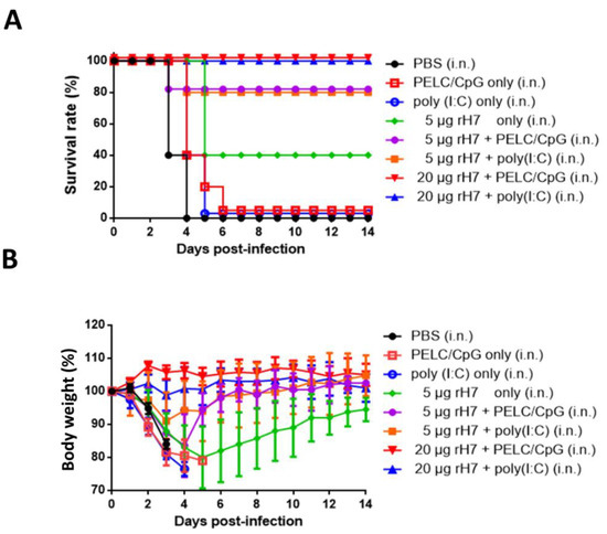 Figure 6. Protective immunity against the H7N9 virus induced by intranasal immunization with rH7 proteins. Mice were challenged with 10 LD50 of the H7N9 virus 3 weeks after the final intranasal immunizations. (A) Survival and (B) body weight loss rates were monitored for 14 days. Mice whose body weights fell below 75% of their initial weights were sacrificed.