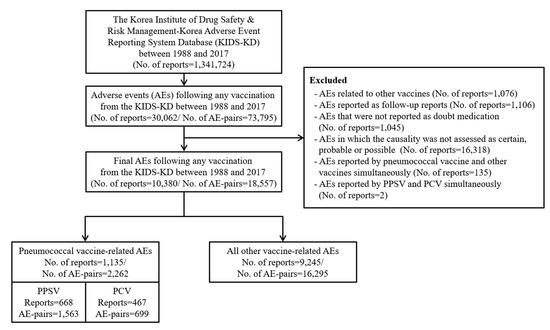From the entire AE reports in KIDS-KD from 1988 to 2017, we used the initial reports that were reported following vaccination. In other words, we excluded AE reports involving pharmaceuticals other than vaccine or with unspecified vaccine product and follow-up report for initially reported AEs. We also excluded the reports without causality assessment or recorded as “unlikely”, “unclassified”, or “unassessable” according to the WHO causality assessment criteria. Lastly, we excluded the reports that listed both PPSV and PCV administered at the same date as these can complicate the interpretation of the signals.