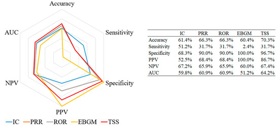 Radar chart of performance measurements for signal detection algorithms about pneumococcal vaccine. Abbreviations: IC, information component; PRR, proportional reporting ratio; ROR, reporting odds ratio; EBGM, empirical Bayes geometric mean; TSS, tree-based scan statistic; PPV, positive predicted value; NPV, negative predicted value; AUC, area under the curve.