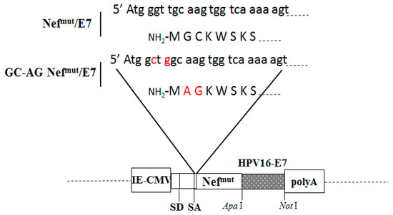 Structure of the DNA molecular constructs expressing Nefmut-based products. On the top, shown are both nucleotide and amino acid N-terminal sequences of both Nefmut/E7 and GC-AG Nefmut/E7. Mutated sequences of the latter are highlighted in red. At the bottom, the structure of both DNA vectors is reported, including the restriction sites where the HPV16-E7 open reading frame was inserted. IE-CMV: immediate-early CMV promoter; SD: major splice donor site; SA major splice acceptor site; polyA: polyadenylation site.
