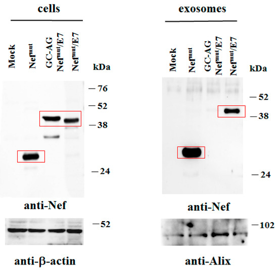 The following are available online at https://www.mdpi.com/2076-393X/8/2/243/s1, Figure S1: Uncropped blots showing all the bands with all molecular weight of Figure 3—Analysis of expression of GC-AG Nefmut/E7. Western blot analysis of total cell lysates from HEK-293T cells transfected with DNA vectors expressing the indicated Nefmut-based fusion products; Figure S2: Uncropped blots showing all the bands with all molecular weight markers of Figure 4—Analysis of stability of GC-AG Nefmut/E7. Comparative stability analysis between Nefmut/E7 and GC-AG Nefmut/E7 fusion proteins in total lysates from HEK-293T cells transfected with the respective DNA vectors; Figure S3: Uncropped blots showing all the bands with all molecular weight markers of Figure 5—Detection of Nefmut/E7 based fusion products in transfected cells and exosomes. Shown is the Western blot analysis of total lysates from the same number of HEK293T cells transfected with DNA vectors expressing either Nefmut/E7 or GC-AG Nefmut/E7 (left panels). Equal volumes of buffer, where purified exosomes were resuspended after differential centrifugations of the respective supernatants, were also analyzed (right panel).