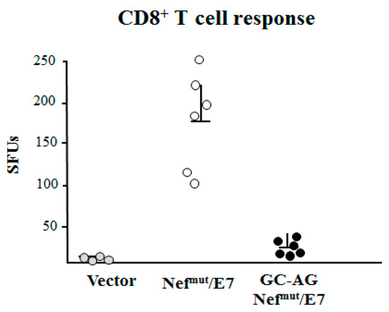 Next, we evaluated the immunogenicity of DNA vectors expressing Nefmut/E7 and its GC-AG mutant. C57 Bl/6 mice were inoculated i.m. in each quadriceps with 50 μg of the two DNA vectors and, as control, with equal amounts of void vector. The inoculations were repeated 14 days later, and after an additional 14 days, mice were sacrificed. Splenocytes were then isolated and cultured overnight in IFN-γ ELISpot microwells in the presence of either unrelated or E7-specific nonamers. We noticed a sustained E7-specific cell activation in splenocytes from mice inoculated with Nefmut/E7-expressing vector but not in those from mice injected with GC-AG Nefmut/E7 (Figure 6). Thus, the GC to AG amino acid substitutions at N-terminus of Nefmut/E7 strongly affected the downstream induction of antigen-specific CD8+ T-cell activity. Taken together, these data strongly enforce the idea that the in vivo generation of EVs uploading Nefmut-derivatives is the key event for the CD8+ T-cell immune response.