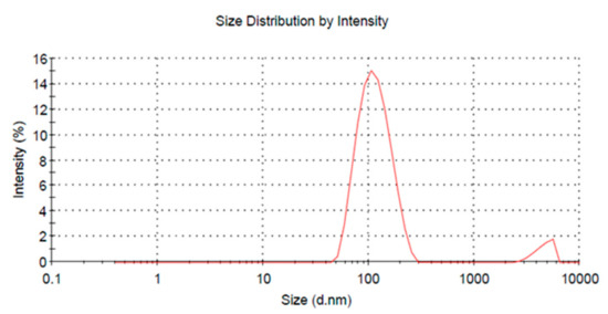 VRIL23 was encapsulated in chitosan nanoparticles with an average diameter of 109.6 nm, and the zeta potential of the nanoparticles was +24.5 mV (Figure 5). Figure 6 shows the spherical shape of chitosan nanoparticles under the transmission electron microscope.