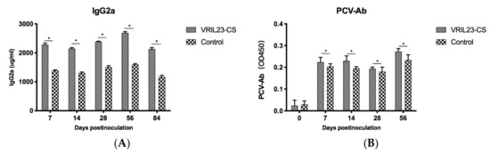 Changes of specific antibody and immunoglobulins in the sera of experimental pigs. (A) lgG2a; (B) PCV-Ab. * indicates the difference between the two groups is significant, p < 0.05.