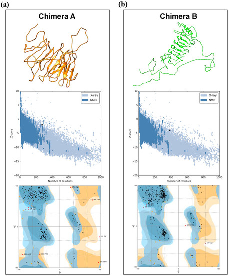 Illustrative representation of 3D structures for chimeras A and B and the validation parameters provided by Rampage and ProSA web servers. Chimera A (a) is represented by orange color and chimera B (b) is represented by green color. ProSA analysis and Ramachandran diagrams are represented in the figure for both chimeras (above 3D structures). The quality of the models is given by the z-score (−3.05) predicted by the ProSA, whereas Ramachandran diagrams show the distribution of the amino acid in favored, allowed, and disallowed regions.
