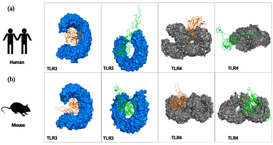 Interaction of refined models for chimeras A and B with toll-like receptors using molecular docking (ClusPro2.0 web server). Representation of the best docked-complex between chimeras and human (a) and mouse (b) toll-like receptor (TLR)3 (blue) and TLR4 (grey). Chimera A (a) is represented by orange, chimera B is represented by green.