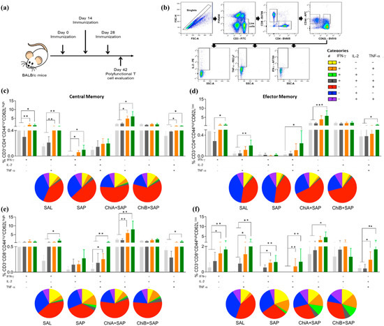 Percentage of polyfunctional T cells in spleens of immunized mice with ChiA+SAP (animals that received 10 μg of the chimeric protein A associated with 60 μg of saponin) and ChiB+SAP (animals inoculated with 10 μg of chimeric protein B associated with 60 μg of saponin). Polyfunctional T cells were evaluated by percentage of intracellular IL-2, TNF-α, and IFN-γ producing T cells (central and effector memory) at the same time. (a) BALB/c mice were immunized three times and polyfunctional T cells were assessed in spleen 14 days after the last immunization using multicolor flow cytometry. (b) Representative plot of the gating strategy to characterize the multifunctional T cell producers of intracellular IFN-γ, TNF-α, and IL-2 using the Boolean gate strategy. (c) The percentage of CD3+CD4+CD44highCD62Lhigh and (d) CD3+CD4+CD44highCD62Llow cells producing single, double, and triple cytokines after in vitro stimulation with SLA (soluble Leishmania antigen). (e) The percentage of CD3+CD8+CD44highCD62Lhigh and (f) CD3+CD8+CD44highCD62Llow producing single, double, and triple cytokines in vitro after stimulation with SLA. The groups SAL (animals that received sterile saline, 0.9% NaCl, pH 7.2–7.4), SAP (animals inoculated with 60 μg of saponin), ChiA+SAP, and ChiB+SAP are represented by the colors light grey, dark grey, orange, and green, respectively, and pizza graphs represent the pattern of cytokine production. Data are expressed as means plus/minus standard deviation of two independent experiments (n = 8). Significant differences between the groups are represented by p-values: * p-value < 0.05, ** p-value < 0.005, *** p-value < 0.0005.