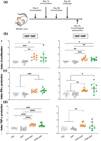 To evaluate the efficiency of the chimeras A and B to promote specific immune responses in vivo, BALB/c mice were immunized with three doses of chimeras with saponin (2-week intervals) and then challenged with promastigotas of L. infantum. Thirty days after challenge, they were euthanized (Figure 4a). The results of the proliferation of splenocyte and intracytoplasmic cytokine production were expressed as culture index stimulated by the control culture (SC/CC). The representative plot of the gating strategy for CFSE-labelled cells is shown in Figure S3. According to the data (Figure 4b), ChiA+SAP induced a higher CD4+ and CD8+ T cell proliferation when compared to SAL and SAP groups, whereas ChiB+SAP induced a significant CD4+ T cell proliferation compared to SAL. Regarding intracellular IFN-γ production by CD4+ and CD8+ T lymphocytes, we observed a significant increase in ChiA+SAP and ChiB+SAP compared to SAL and SAP groups (Figure 4c). Further, ChiA+SAP and ChiB+SAP were capable of increasing the production of TNF-α by CD4+ T cells and only ChiA+SAP increased the production of this cytokine by CD8+ T cells when compared to control groups (Figure 4d).